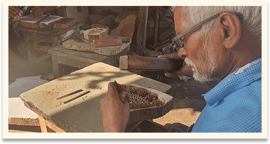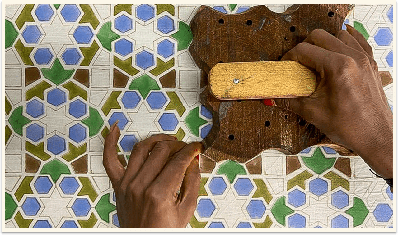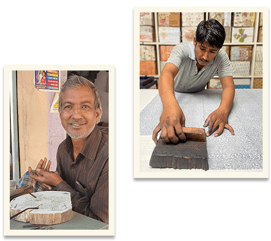 Op stukken hout worden patronen getekend en vervolgens uitgekerfd met smalle beitels. Hiervoor wordt vaak gebruik gemaakt van de Indiase Rosewood boom (ook bekend als 'Sheesham wood') omdat deze soorten harder zijn en dus geschikter om vormen in te snijden zonder dat het hout hierdoor kapot gaat. Het afgewerkte blok ziet eruit als een reliëf kunstwerk, vergelijkbaar met een ets, waarbij de vormen van de toekomstige afdruk zichtbaar worden. Dit is tijdrovend werk, omdat voor elke kleur van een print een ander stuk hout moet worden bewerkt en deze stukken moeten ook goed op elkaar passen.
