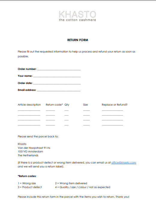 Let op: Wij dekken verzendkosten van retournering alleen als er sprake is van een mankement aan het product of als onverhoopt een verkeerd product verstuurd is. We raden je dan ook aan je retour altijd met track en trace code te verzenden. Khasto is niet aansprakelijk voor het zoekraken van retouren.